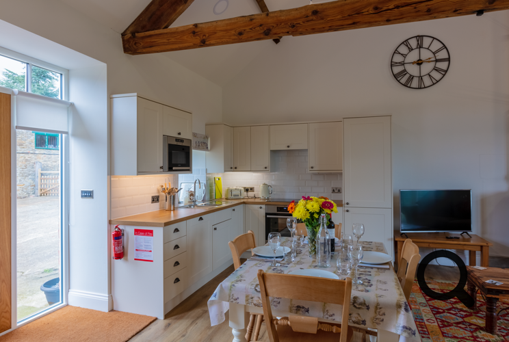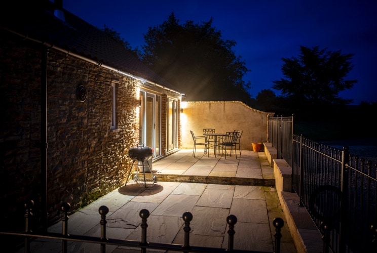Step into cottage from parking area. Enclosed courtyard with patio, garden furniture and BBQ. 1 dog welcome, to be kept on a lead at all times (working farm with sheep). Bike store. Private parking for 2 cars. No smoking. Please note: There is a step out to the courtyard.