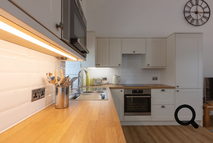 Farmhouse style with electric oven, electric hob, microwave, fridge/freezer, dishwasher.